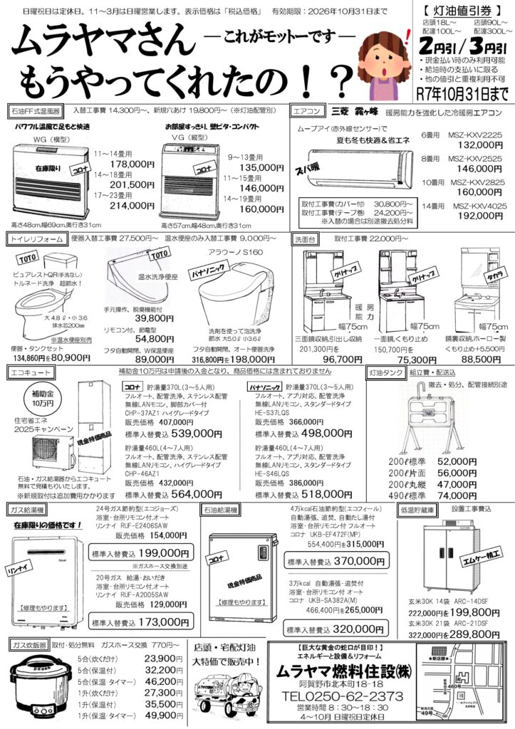 チラシ2025年10月 2025年10月2日 最終更新日時 : 2025年10月2日 ムラヤマ燃料住設 株式会社 投稿者プロフィール ムラヤマ燃料住設 株式会社 最新の投稿 今月のチラシ2025年10月2日チラシ2025年10月 ムラヤマタイムズ2025年10月2日ムラヤマタイムズ2025年10月号 ムラヤマタイムズ2025年10月2日ムラヤマタイムズ2025年9月号 今月のチラシ2025年10月2日チラシ2025年9月