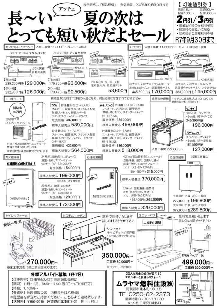 チラシ2025年9月 2025年10月2日 最終更新日時 : 2025年10月2日 ムラヤマ燃料住設 株式会社 投稿者プロフィール ムラヤマ燃料住設 株式会社 最新の投稿 今月のチラシ2025年10月2日チラシ2025年10月 ムラヤマタイムズ2025年10月2日ムラヤマタイムズ2025年10月号 ムラヤマタイムズ2025年10月2日ムラヤマタイムズ2025年9月号 今月のチラシ2025年10月2日チラシ2025年9月